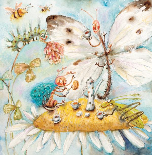 Сидела на ромашечкеБукатая жукашечкаИ средней парой ножечекДержала хлеб и ножичек.С чайком дымятся чашечки —Спешат друзья к жукашечке.Жужжание-гудение —Спешат на День рождения:Бабусеничка-душечка,Гусябочка,Жабушечка,Стрекочики усатыеИ шмёлы полосатые…Нарядная жукашечка —Красивые кудряшечки,Серёжечки-петелечки…Ведь ей уж пол-не-де-леч-ки!