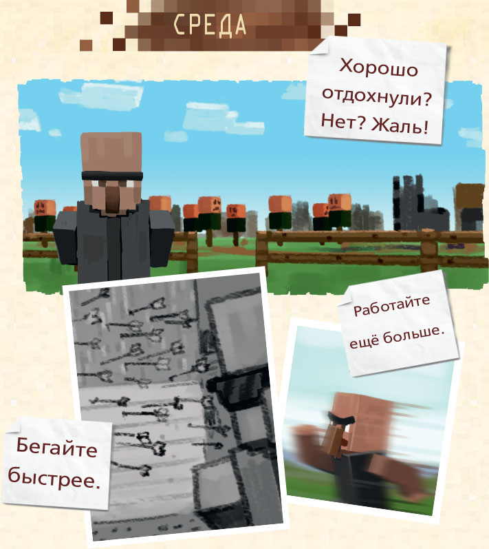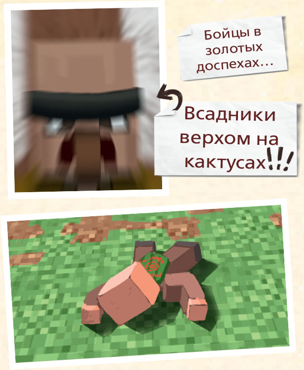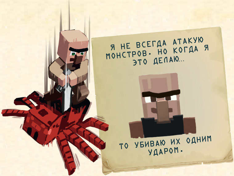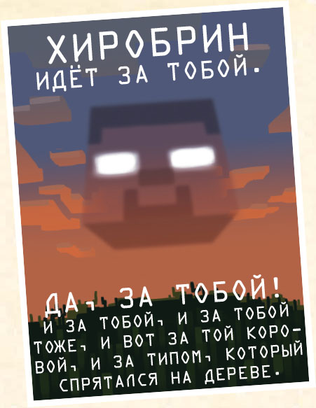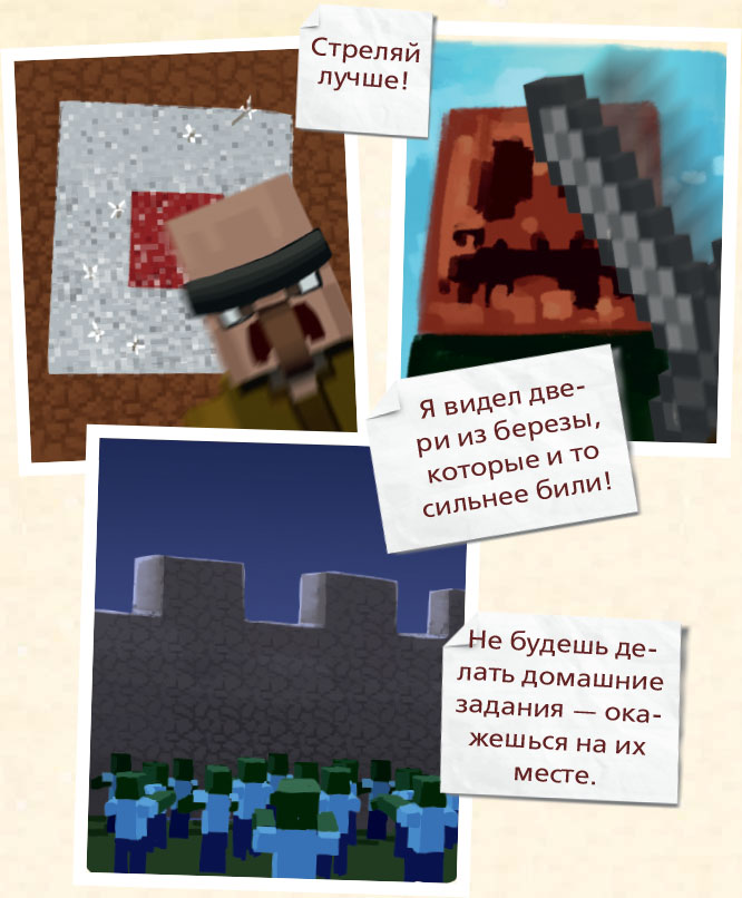 – Пусть мобы атакуют! Пусть криперы взрываются в ночи! Мы их поблагодарим, когда придет утро, за то, что помогли нам собрать еще земли и песка. Мы их поблагодарим, поскольку нам больше не понадобятся лопаты!