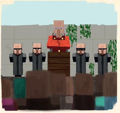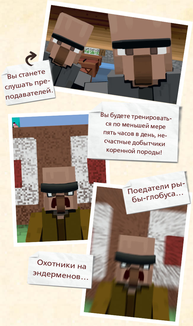– Мобы ушли… но надолго ли? Что они попытаются сделать дальше? Вы должны внимательно слушать всё, что говорят учителя, чтобы стать талантливыми воинами… Вы будете проводить часы над книгами о мобах, чтобы подготовиться защищать вашу деревню… Вы станете тренироваться с саблей на манекенах, чтобы у следующего поколения было лучшее будущее…