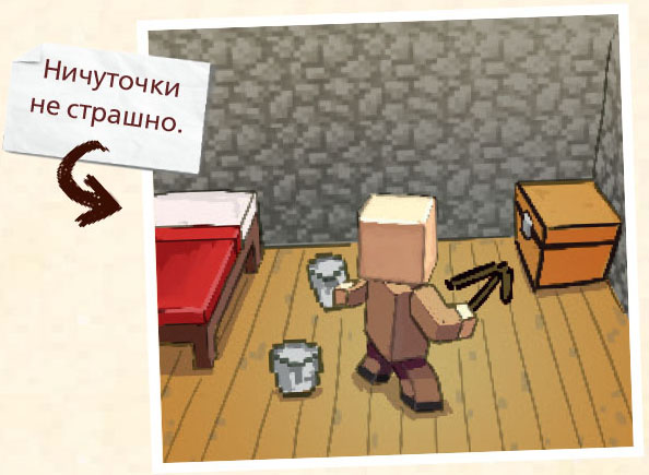 Я тут же прекратил стучать киркой.Нет, не спешите!Я вовсе не струсил. Ну, правда, кто же испугается капельки яда, из-за которой шкала жизни понижается до половины сердечка, а значит, её не хватит даже на то, чтобы отбить атаку одноногой курицы– только и останется, что обливаться потом и корчиться от боли… Кто испугается? Не я. Меня просто мучила жажда. Не знаю почему, но мне действительно очень хотелосьвыпить огромное ведро молока. Я всё бросил и пошёл за ним на кухню. Кстати, обратно я принёс даже дваведра. Одно поставил на пол рядом с собой. Взял кирку в одну руку, а ведро держал в другой. Вдруг мне снова захочется пить, понимаете?