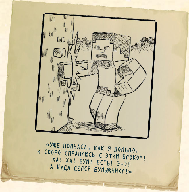 «Что за моб сидит внутри?Судя по звуку,детёныш гаста. Я никогда не видел настоящих гастов, но кое-что читал о них. Кажется, они водятся-только в Нижнем мире. К тому же детёнышей-гаста даже не существует, а взрослый никогда не смог бы поместиться в таком крохотном пространстве. М-да-а-а.А может, это паук. Но я никогда не слышал, чтобы пауки издавали такие звуки. А вдруг это… пещерный паук?Макс как-то рассказывал мне о нём. Он сказал, что при виде пещерного паука все бросаются наутёк, вопят и голосят, как странник Края, затерявшийся в биоме Океан. Ещё он говорил, что пещерные пауки почти так же опасны, как заряженные криперы.