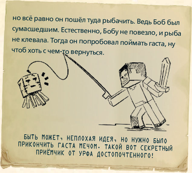 В общем, конец истории таков:гаст, стоя где-то в двух блоках от Боба, швырнул в него огненный шар, а тот не смог увернуться. И остались от Боба одни пузырьки.