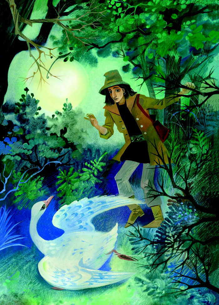 Пошёл наш герой по лесу, и всё смотрит, когда свет ярче, а когда тише. Если гаснет – значит, сбивается паренёк с пути. Если разгорается – значит, всё ближе к кладу. Так он вышел на поляну, а там гусыня. Стоит на месте – в силки попала. И только слёзы из глаз пускает, совсем как человек.