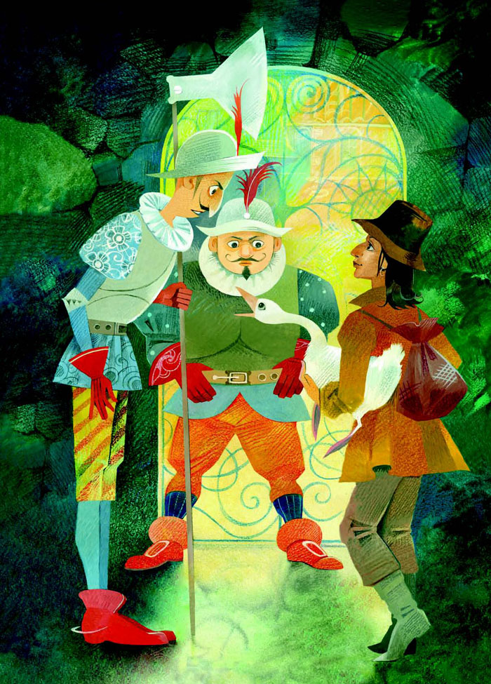 Приходит наш герой ко дворцу и просит его впустить: у меня, мол, тут вещая гусыня, хочу её королю показать, Его Величество потешить. А стража его на смех поднимает и никуда пускать не хочет. Тут гусыня встрепенулась и говорит пареньку: