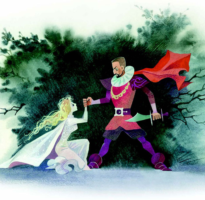 – Когда королевична сказала, что если её брат умрёт, то и министру не жить, он её решил убить. Увёз в лес и там ножом заколол. Косточки бросил в лесу, чтобы волки растащили и следа не осталось. Но министр жадный, сам себя проклял: снял с мёртвой королевичны всё золото и закопал там же, где убил её. А золото от крови волшебным становится. Вернулась королевична к нему птицей, да попала в ловушку. Очень боялся жадный министр, что золото воры утащат, и силки поставил…