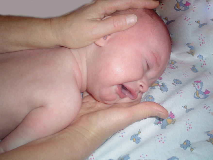 7. Ребенка положить на бок. Голову своей ладонью приподнять на несколько секунд. Необходимо добиться, чтобы ребенок себя чувствовал одинаково хорошо на любом боку. Постепенно добиться вертикального положения головы (фото 7а, 7б, 7в,7г)