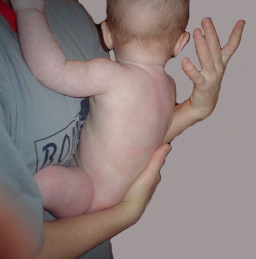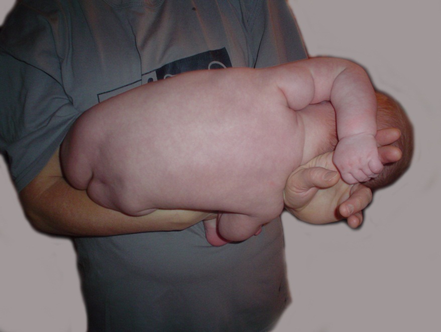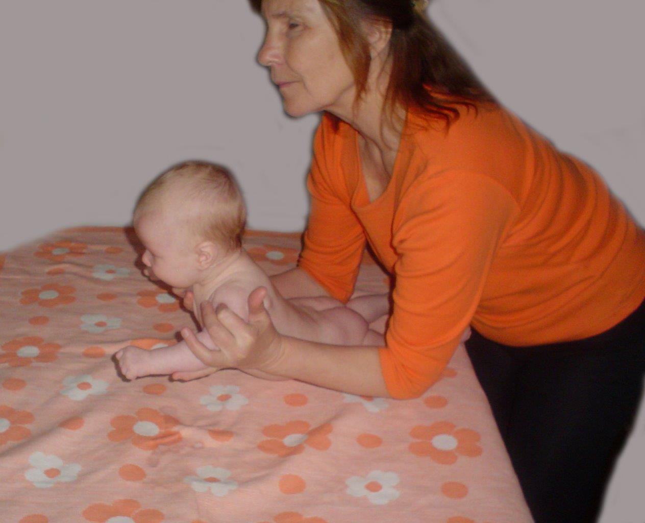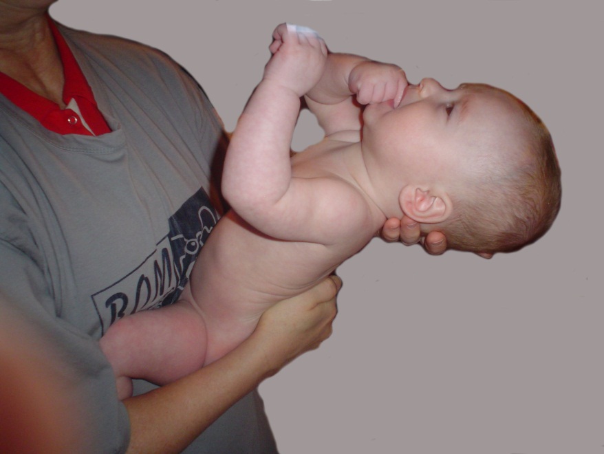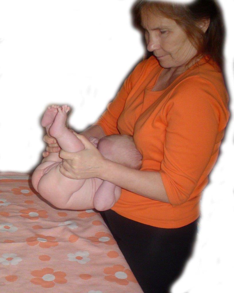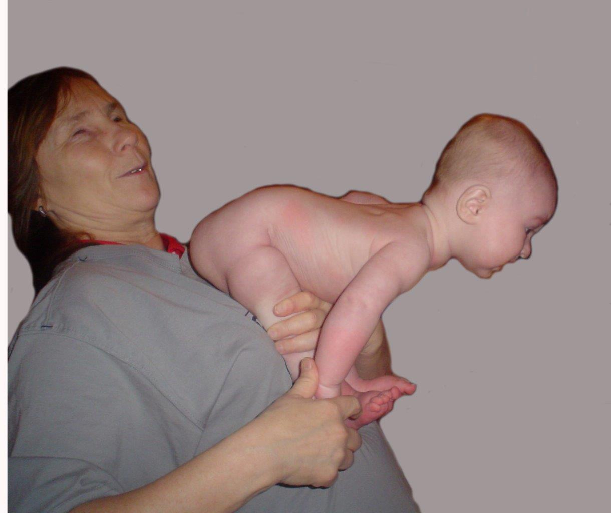2.Возьмите ребенка спиной к себе, поддерживая под колени (3–5 сек). Колени старайтесь поднять на уровень лица ребенка. Делать несколько раз в день. Называется «Поза эмбриона» (фото 2).