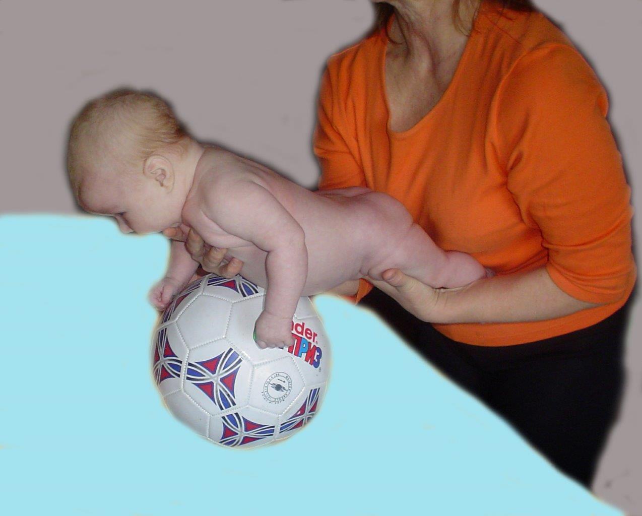 3.Ребенка положите животиком на мяч диаметром 20–30 см так, чтобы стопы ребенка касались вас, а ладони ребенка находились на мяче под плечевыми суставами. Держите ребенка за запястья, прижимая его ладони к мячу, и покачивайте его вперед-назад. Перед мячом желательно положить увлекательную заводную игрушку. Делать упражнение несколько раз в день по 1-3 мин, пока оно нравится ребенку. Начинайте со второй недели жизни (фото3).