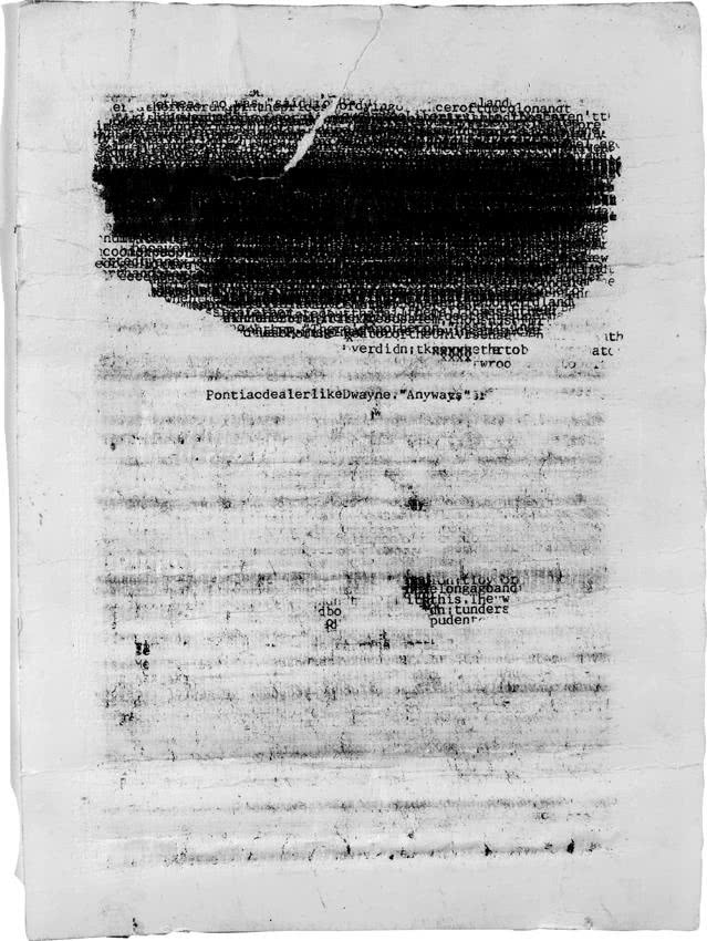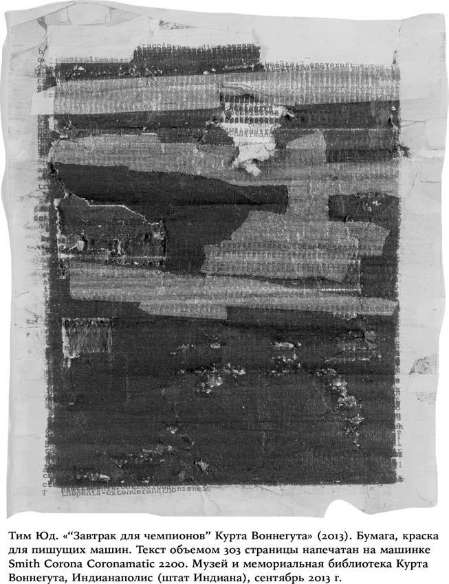 ~Сразу же после того, как мне предложили заняться этим проектом, Джулия Уайтхед, основательница Мемориальной библиотеки Воннегута, вывела меня на художника Тима Юда, который тогда как раз проводил перформанс в библиотеке. В чем состоит его художественный эксперимент? Художник заново печатает романы на такой же пишущей машинке, что и писатель, в том же месте, где тот работал (или там, где происходит действие романа). Он печатает весь роман, снова и снова заправляя в машинку одну и ту же страницу (подложив еще один лист – для мягкости), одновременно читая набираемый роман вслух, «бормоча себе под нос», – чтобы не потерять строчку и сохранять вовлеченность в текст. Страница рвется. Он заклеивает ее белой лентой и продолжает работу. Эти случайные пробоины и разрывы создают осязаемое произведение искусства. В конце он отделяет верхний лист от нижнего и помещает каждый в рамку.