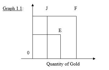 Graph 1.1 shows that, the quantity of gold demanded for non-monetary purposes will go down and the quantity supplied of gold is also expected to increase after an increase in the price of gold. Under the Gold Standard System, the government will fix the mint price above the Po level to assure that there is an adequate supply of gold to make coins out of. At a mint price of Pm, the quantity demanded of gold for monetary purposes is the distance between the origin and point Q1, whereas the quantity supplied of gold equals the distance between the origin and point Q2. In this case, the distance between Q1 and Q2 or the range between points E and F will be the gold used in the making of coins. (i.e. excess supply of gold available for gold coins.)