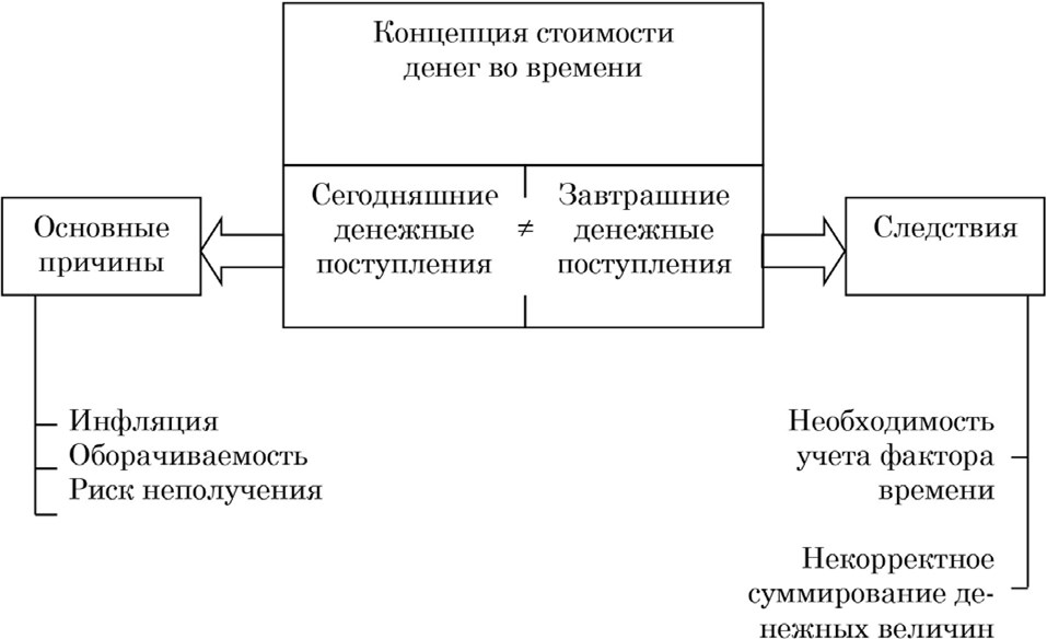 Необходимость учета временного фактора вытекает из сущности финансирования, кредитования и инвестирования и выражается в принципе неравнозначности денег, относящихся к разным моментам времени (time-value of money, TVM), или в другой формулировке – концепции стоимости денег во времени, логическая схема которой представлена на рис. 1.
