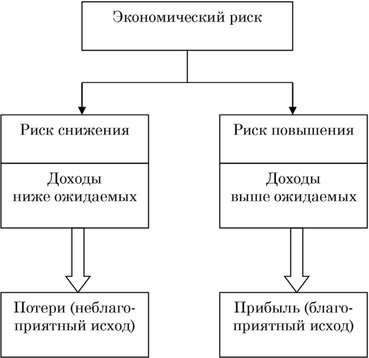 В. В. Глущенко и И. И. Глущенко обращают внимание на то, что существует два взгляда на сущность риска, расширяя тем самым первое определение риска. «Во-первых, риск – это возможная неудача, материальная или финансовая потеря; во-вторых, риск отождествляют с удачей, благоприятным исходом, извлечением прибыли, которые могут наступать в результате реализации отдельных удачных решений».7 «Риск означает вероятность того, что доход на сделанную инвестицию будет отличаться от ожидаемого. Таким образом, риск включает в себя не только неблагоприятные (доходы ниже ожидаемых), но и благоприятные (доходы выше ожидаемых) исходы. На практике первый вид риска можно назвать «риск снижения» (downside risk), а второй вид – «риск повышения» (upside risk)»8. Подходы к трактовке понятия «экономический риск» представлены на рис. 2.