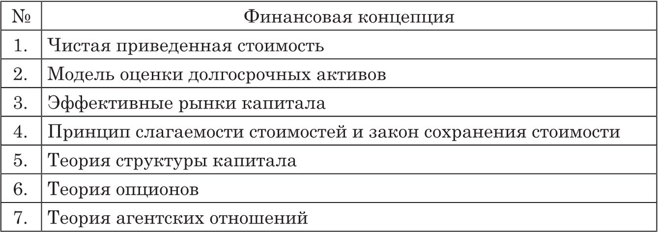 Фундаментом финансового менеджмента, по Р. Брейли и С. Майерсу, являются семь финансовых концепций, список которых представлен в табл. 1.