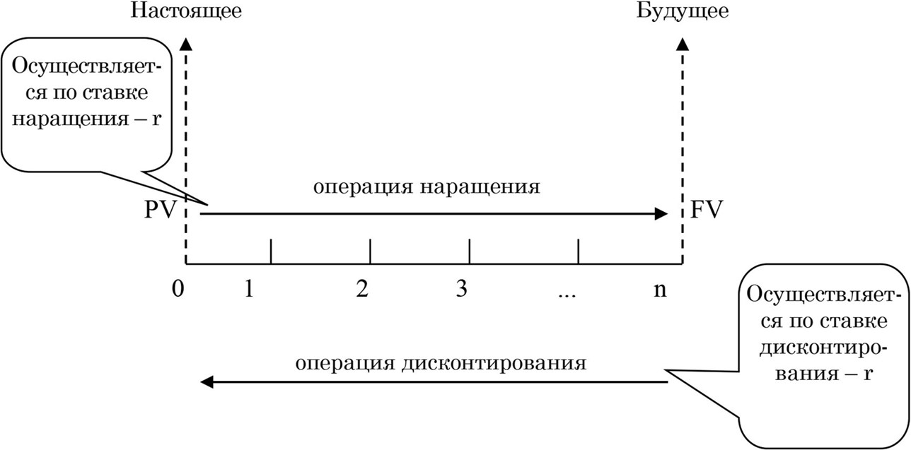 Ю. Брикхэм и М. Эрхардт определяют процесс наращения (compounding) «как процесс перехода от текущей (приведенной) стоимости (present value, PV) к будущей стоимости (future value, FV)»27, а дисконтирование (discounting) характеризуют как процесс «определения текущей (приведенной) стоимости»28.