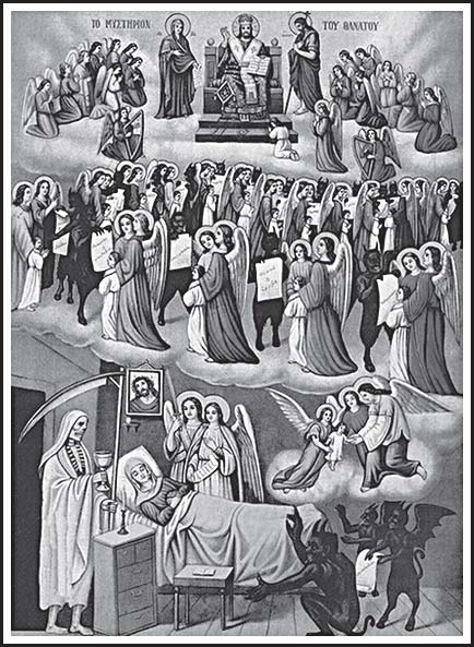 В Священном Предании, согласном со Священным Писанием, мы находим учение о мытарствах[10]. Сущность учения о мытарствах излагает свт. Кирилл Александрийский в слове «О исходе души». Мытарства – это неизбежный путь, которым совершают свой переход от временной земной жизни к вечному жребию все души человеческие, как злые, так и добрые. На мытарствах душа в присутствии Ангелов и демонов, но и пред оком всевидящего Судии Бога испытывается во всех делах, словах и помышлениях. Души добрые, оправданные на мытарствах, возносятся Ангелами в райские обители для предначатия вечного блаженства, а души грешные, задержанные на том или другом мытарстве, влекутся демонами в их мрачные обители для предначатия вечного мучения.