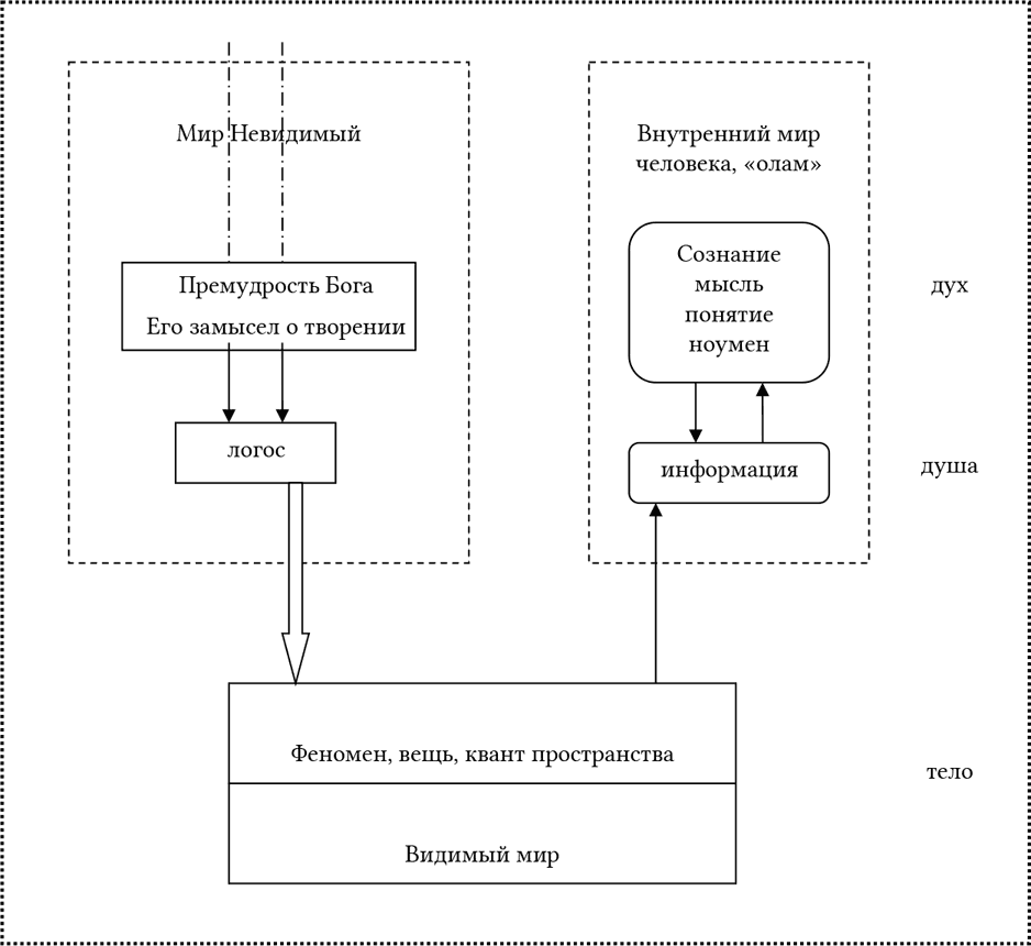 Слева на рис. 1 Мир Невидимый, Премудрость Бога, Его замысел о творении – логос. Справа – внутренний мир человека, «олам»: сознание, мысль, понятие, ноумен, информация. Феномен, вещь, квант пространства представляют видимый мир, внизу, в центре рисунка.