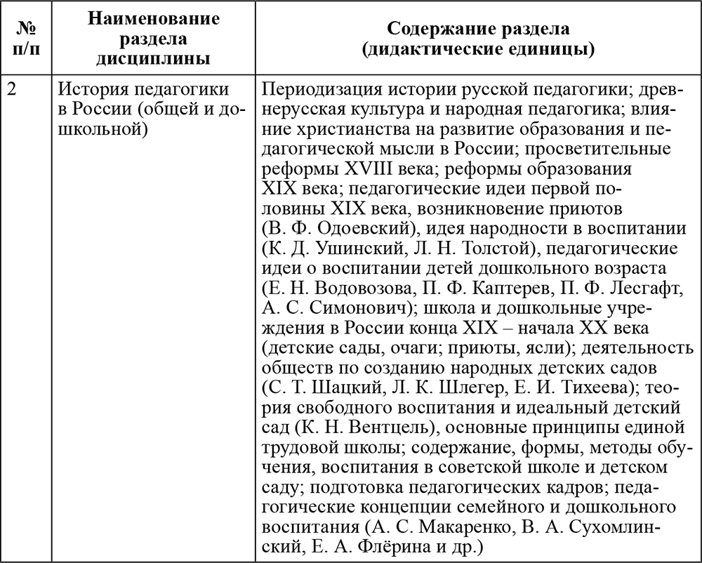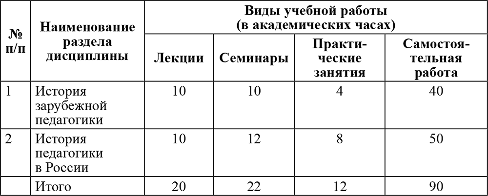 Дисциплина строится по хронологическому принципу и разделяется на две части: 1) история зарубежной педагогики; 2) история педагогики в России.