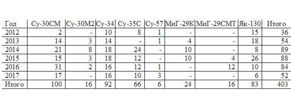 Однако не все эти предложения были приняты, о чем свидетельствуют обобщенные данные о количестве боевых и учебно-боевых самолетов, поступивших на вооружение ВКС и авиации ВМФ России, составленные на основе открытых источников информации и фотографий споттеров: