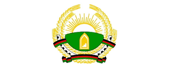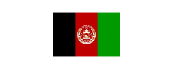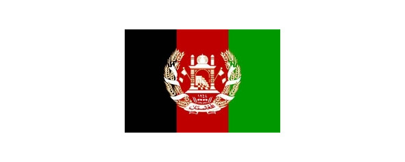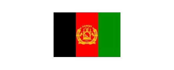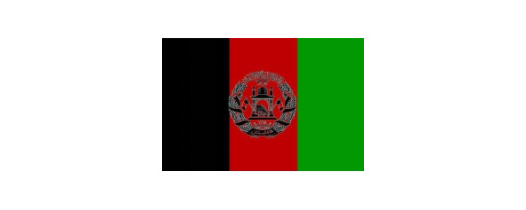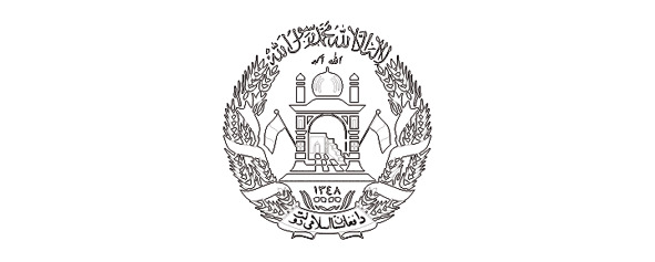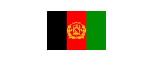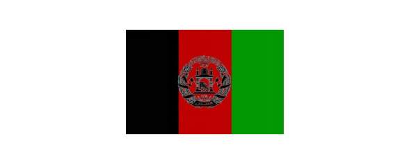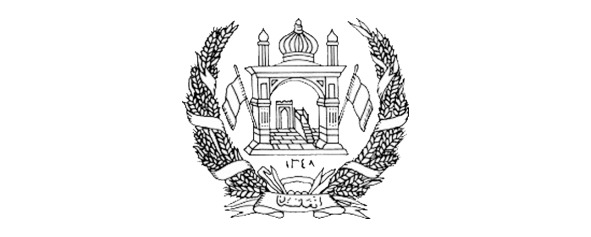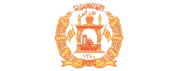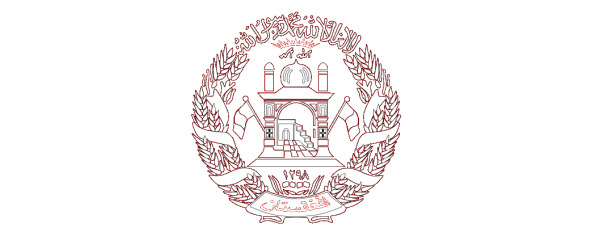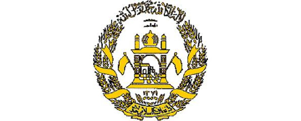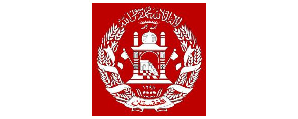 Пшеничные колосья перевиты лентой цветов флага, на нижнем витке ленты арабскими буквами написано название страны: «Афганистан».