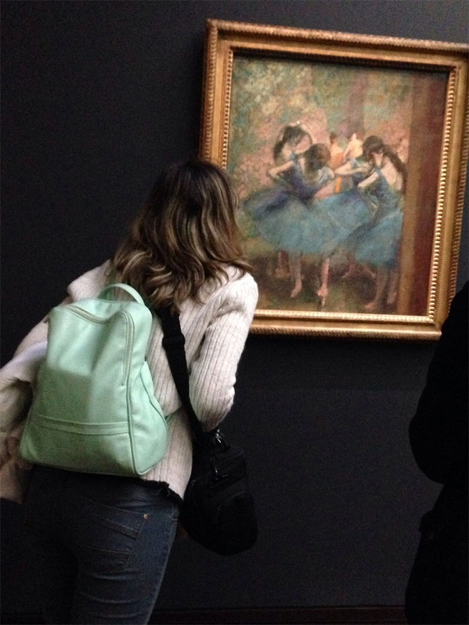 …Музей оказался просто потрясающим, в буквальном смысле! Вика побежала на верхние этажи смотреть импрессионистов, Анечка пошла любоваться скульптурами Родена, а я осталась рядом со входом разглядывать картины на восточную тему. Представляя себя изображенными обнаженными наложницами… эх!… Потом, минуя два других этажа, я тоже помчалась смотреть, что это за звери такие – импрессионисты. Наша талантливая Викулька зря смотреть никого не будет, значит надо тоже отметиться.)) Поднявшись на эскалаторе и зайдя в первый зал импрессионистов, я потеряла дар речи – настолько была действительно поражена красотой этих картин! Несмотря на то, что народу здесь было больше всего, не продохнуть. Меня поразили эти картины своей светлостью, лёгкостью восприятия и каким-то неимоверным желанием жить!! При всем моем уважении к классике – именно такого ощущения – легкости, прозрачности – картины в классическом стиле не дают. Думаю, почаще нашим трансгендерам надо импрессионистов смотреть… Для позитива.)) Моне, Мане, Дега, Ренуар, Сезанн, Базиль – там есть на что полюбоваться! В зале, где был выставлен Базель, играла классическая музыка. Это что-то с чем-то – слышишь музыку в стиле патетической симфонии и смотришь на светлые картины… Этажом ниже – Ван Гог, Гоген – Но они уже не вызывали у меня таких легких светлых чувств. Просто посмотрела.