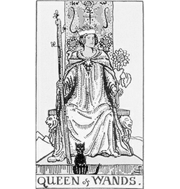 Как и Король, Королева Жезлов изображается сидящей на троне, одетой в элегантную мантию и с короной на голове. Это обычно красивая зрелая женщина, воплощающая женскую власть, уверенность, тепло и энтузиазм. В раскладе Королева может обозначать реального человека. Когда это происходит, речь идет о ком-то активном, энергичном и общительном, возможно, о женщине с творческой натурой.
