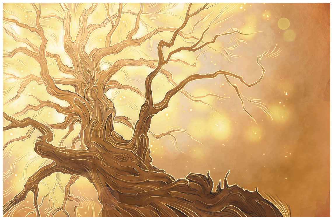 Мировое дерево – своеобразная дорога, по которой можно перейти в иной мир, в мир изобилия. Так в русской народной сказке «Петух и жерновцы» из жёлудя, случайно уроненного в подпол, вырастает огромный дуб высотой до самого неба. Старик по дереву взбирается на небо и находит там волшебное животное – петушка – и волшебный предмет – жерновцы (ручная мельница), которые создают блины и пироги.