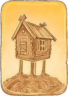 Изба не простая, она на курьих ножках. Когда-то для инициации подростков в лесу строили сооружение, видом напоминающее какое-либо животное. Во время инициации происходило символическое умирание подростка и возрождение в статусе взрослого члена племени. Всё это отразилось в волшебных сказках.