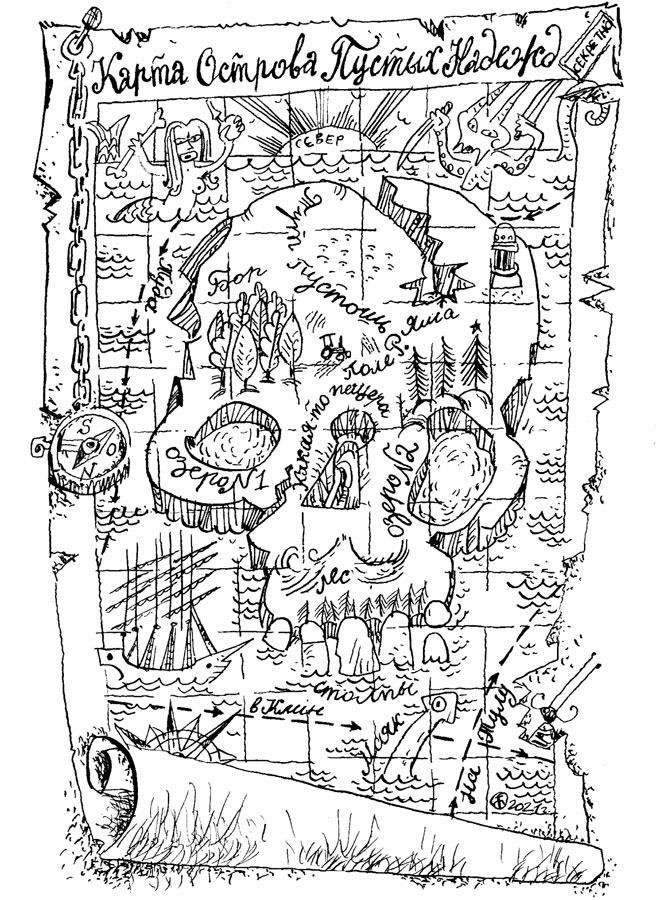 Артем хмыкнул: наверняка поддельные. Не золото же! Он продолжил поиски. Большинство сундуков были пусты, но в одном лежал свиток, перевязанный бечевкой. Артем развязал узел: свиток оказался картой. Артем сел на пол и разложил карту перед собой. На потрескавшейся от времени бумаге был изображен остров. «Остров Пустых Надежд» – гласила надпись. Очертаниями остров походил на череп: вместо глазниц – озера; там, где провал носа, – глубокая впадина; сомкнутые челюсти – густой лес. На карте виднелись разные надписи, стрелки и несколько крестиков. Артем хотел разглядеть повнимательнее, но в любой момент могла вернуться бабушка. Поэтому он сделал несколько фотографий на смартфон, решив разобраться позже.