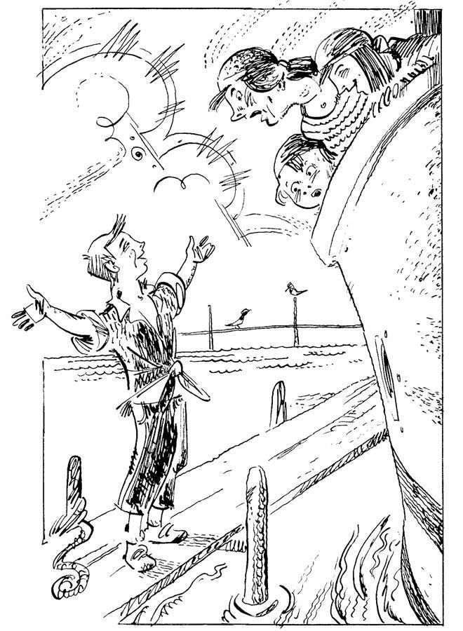 Артем привязал веревку к палубному ограждению и принялся ждать. Вскоре показалась Ксюша, она несла ведро с картофельными очистками. Артем раз – и натянул веревку. Ксюша запнулась. Вед-ро полетело в одну сторону, Ксюша – в другую, картофельная кожура вывалилась на нее.