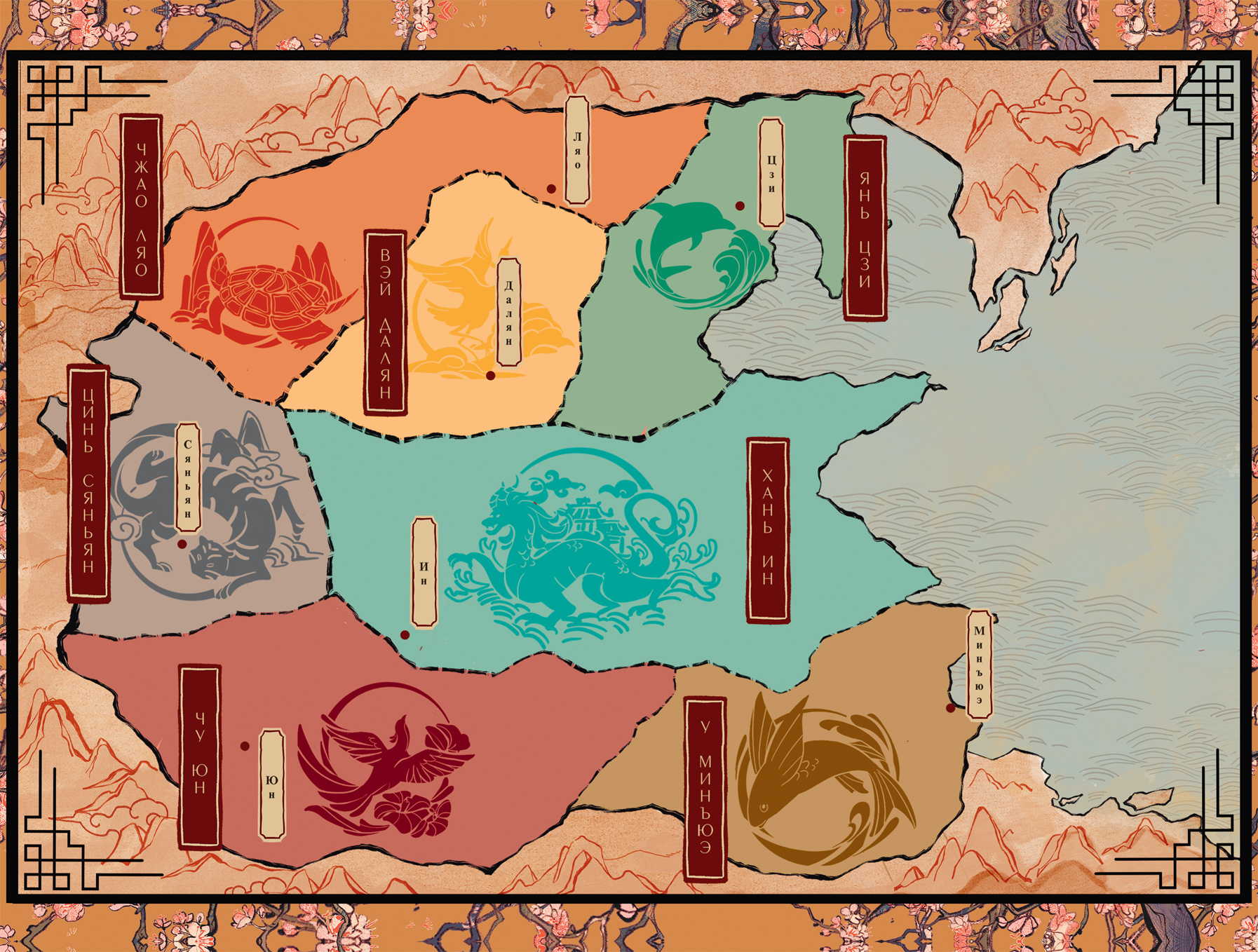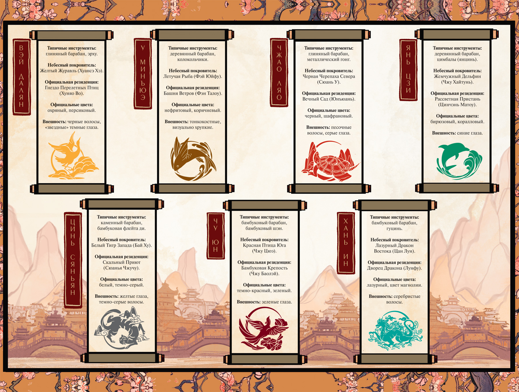 Сыновья божественных владык поделили между собой пробужденную землю, и каждый увел за собой приглянувшихся ему сяней. Так возникли семь Великих кланов. Единственная же дочь Дракона и Феникса, прекрасная Луань-няо, осталась с простыми людьми, помогая им в мирной жизни, и пела так чудесно, что они забывали все невзгоды и печали.