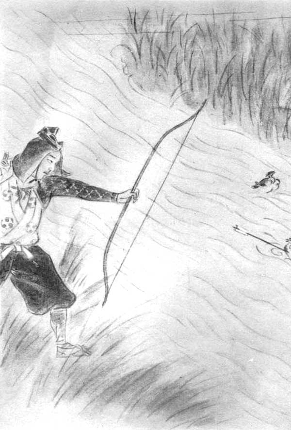 В уезде Тамура-но-Го, что в провинции Муцу, жил-был некий Сондзё, большой мастер соколиной охоты. Однажды, в очередной раз отправившись на промысел, он лишь зря потратил время, так и не отыскав дичи. Но на обратном пути в местечке под названием Аканума попались ему на глаза две осидори (утки-мандаринки)[9], плывшие бок о бок по реке, которую он как раз собирался перейти вброд. Убивать осидори – последнее дело, однако Сондзё изрядно проголодался, а потому вскинул лук и выстрелил в птичек. Стрела попала в самца. Перепуганная самочка метнулась к зарослям тростника на другом берегу и исчезла из виду. Удовольствовавшись одной мертвой уткой, Сондзё принес ее домой и немедленно приготовил себе ужин.