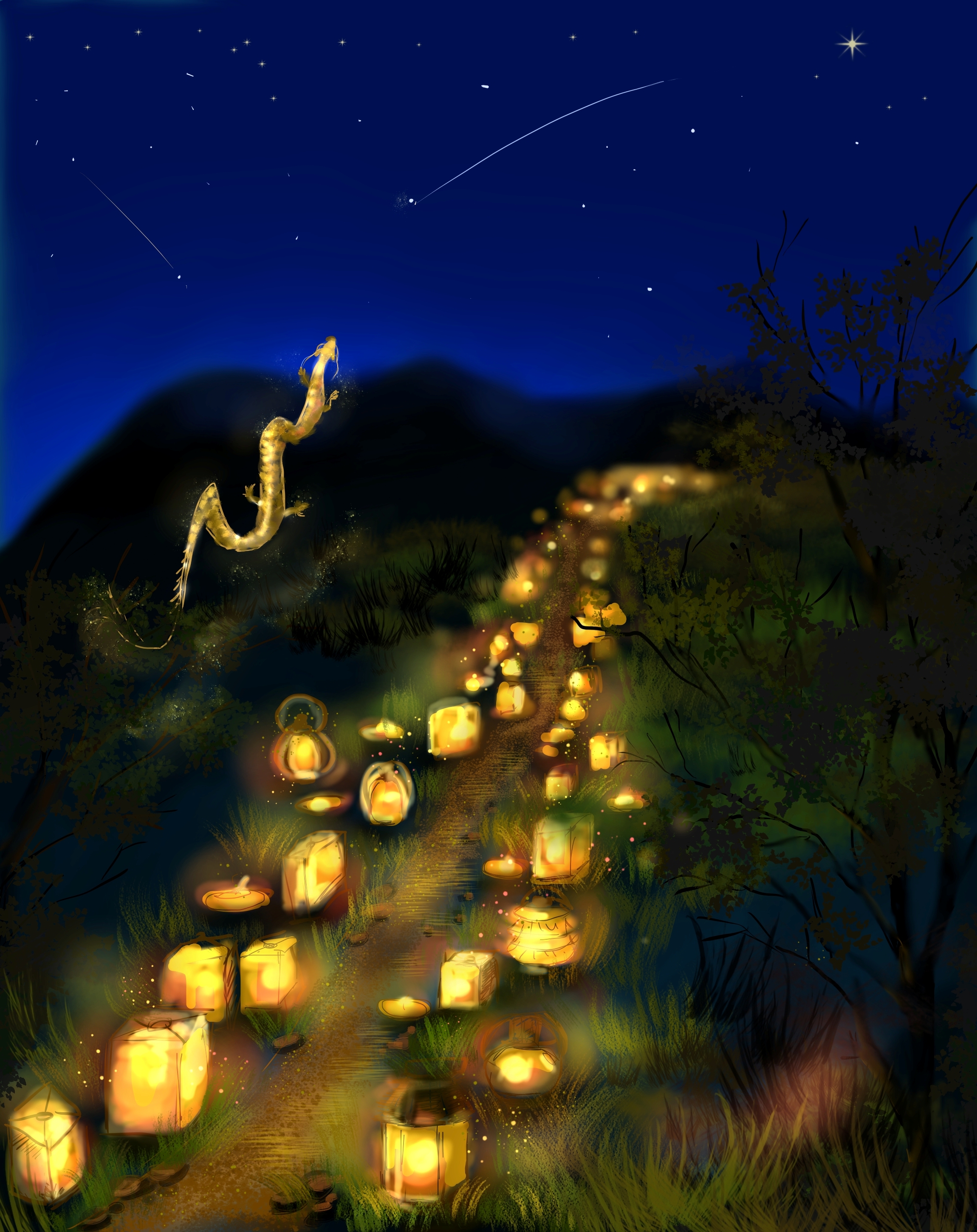 Ребёнок резко дёрнулся и со всех ног понёсся в лесную чащу. Охотница бросилась за ним. Несмотря на свои короткие ноги, ребёнок бежал быстро, ловко минуя заросшие ветки. Икеда запросто потеряла бы его, но огненный пылающий след, что он за собой оставлял, не давал ей заблудиться. След извивался и менял направления, но всегда вёл к быстроногому духу. Воительница сбавила шаг. След прервался у самой опушки, открывая большие горы, что извивались высокими и острыми скалами. Пылающие сгустки масла обрывались у самого основания вершины, словно ребёнок перепрыгнул через них, но дикий угрожающий вопль эхом пронёсшийся по холодным камням, тут же откинул это предположение. Золотые искры сверкнули за горизонтом горы. Свистящий вопль превратился в суровый рык. На Икеду летел дракон, из пасти которого сочилась огненная жидкость. Он присел напротив неё, ударив длинным хвостом по земле. Его пасть горела, белые зубы налезали на нос, седые волоски усов торчали во все стороны и красиво мелькали на бликах луны. На его груди вращался ярко-розовый цветок камелии, что кружил множеством лепестков, словно гипнотизируя непривыкший к такой чарующей красоте глаз. Камелия искрилась золотыми лучами, слепя и будто отпугивая любознательный взгляд. Золотая чешуя, высокий, что Икеде приходилось поднимать шею, но при этом худощавый, вытянутый – огненный змей с пылающей головой дракона.