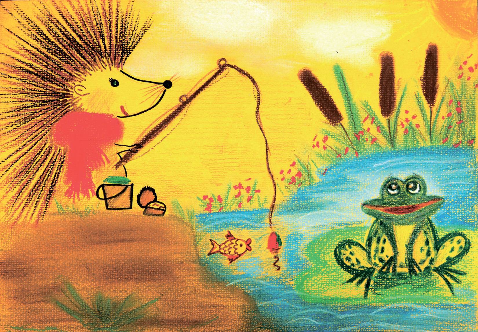 – А ты не мог бы мне помочь, а, Квака? Ну, подтолкни меня к берегу, пожалуйста. Лягушонок спрыгнул в воду, подплыл к Картошкину, и, подталкивая его к берегу, помог выбраться. Мокрый жалкий ёжик, у которого иголки разбрелись в разные стороны, поблагодарил лягушонка за спасение и сел на тёплый камушек сушиться на солнышке.
