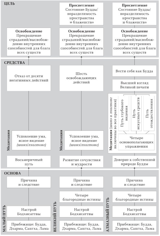Будды – не боги, которые создают, направляют или наказывают, но просто друзья существ. Не ощущая никаких разделений во времени и пространстве, они являются всеведущими и полностью просветленными. Санскритское слово «Будда» происходит от «пробуждения»; выбранное тибетцами слово «Сангье» означает «свободный от всяких завес и полностью развитый». Будда является носителем такого состояния ума, которое кратко можно описать как три уровня, четыре вида активности и пять видов мудрости. Мы будем неоднократно возвращаться к этому, и подробные объяснения можно найти в моей книге «Каким все является на самом деле». Поэтому сейчас коснемся только основных моментов.