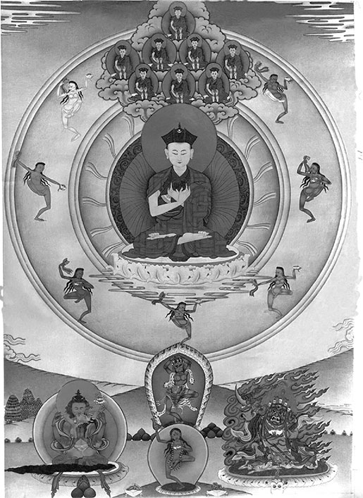 Кармапа (лама в Черной короне) олицетворяет активность всех Будд, и его появление предсказывали Будда Шакьямуни и Гуру Ринпоче. Он первый сознательно перерождающийся лама («тулку») Тибета. С XII века Кармапы возглавляют линию передачи Карма Кагью.