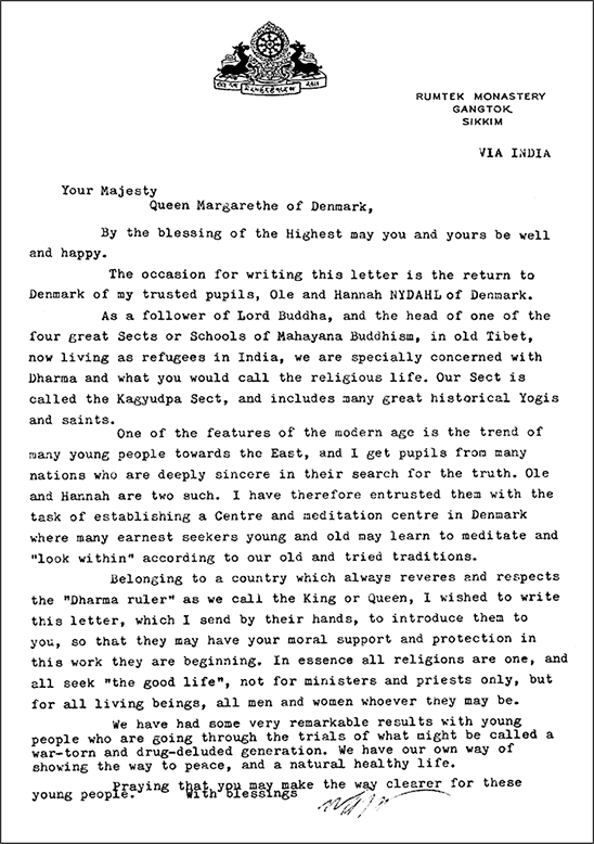 Мы начали с самого верха. Гьялва Кармапа отправил нас домой с письмом Ее Величеству королеве Дании Маргрете. Спустя всего несколько дней после прилета мы получили приглашение на аудиенцию. Мы обнаружили его среди почты, вернувшись утром из лесов южной Швеции. Мы жили в квартире, снятой за 12 долларов в месяц, на чердаке полуразрушенного дома в историческом центре Копенгагена. Из нее открывался красивый вид на Христианию – знаменитую колонию хиппи; рядом поселился мой брат, и наш дом был средоточием огромной свободы, пока власти его не снесли.