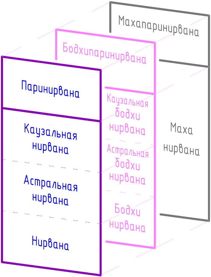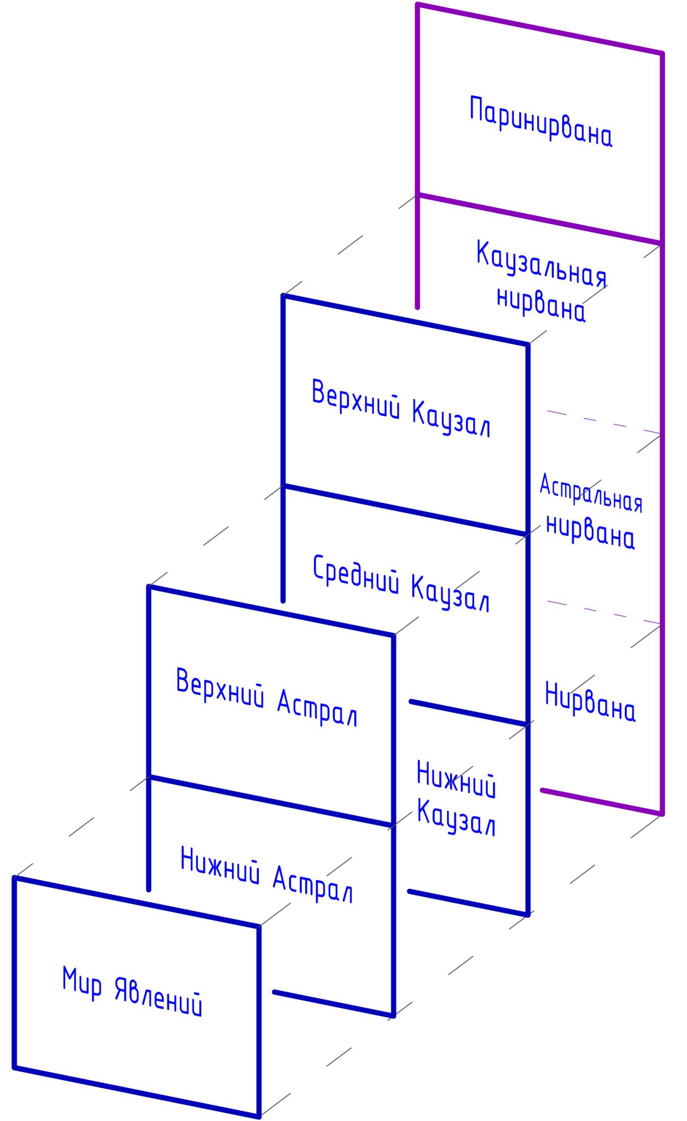 Мир Нирваны – это мир наивысшего Абсолюта. «Нирвана» переводится как «отсутствие волнения». Это состояние освобождения, абсолютного покоя. В сутрах нирвана обозначается как разрушение мирских желаний. Нирвана противопоставляется сансаре, то есть явь, астрал и каузал – это сансара, а нирвана – это не сансара. Различают малую нирвану, нирвану с остатком, паринирвану, бодхинирвану и маханирвану.