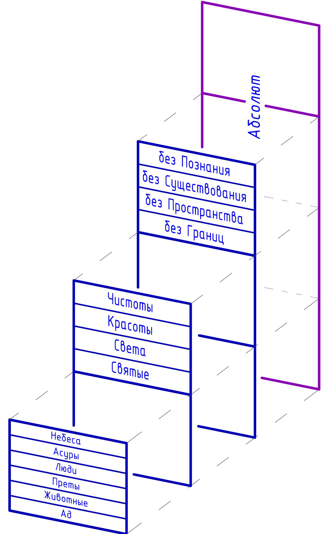 ⦿ Абсолют. Изначальная наивысшая инстанция. Брахман, Ади-Будда, Атман. Абсолют к сансаре индифферентен. Истинное Эго человека изначально является частью Абсолюта (0).