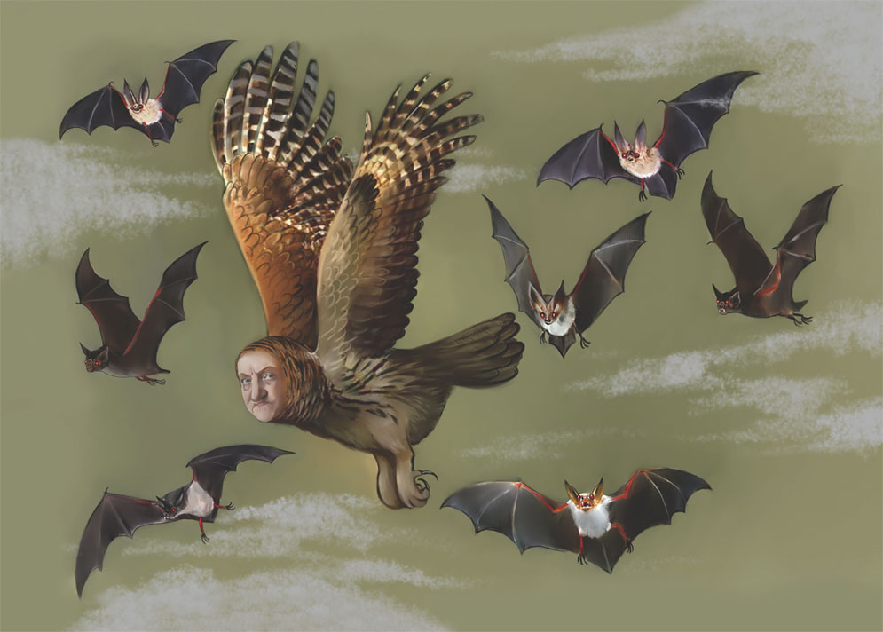 Вдруг небо потемнело, что-то большое и чёрное приближалось к ним. Было слышно хлопанье больших крыльев, ветер поднимал сухие листья с земли, и они кружили, улетая вверх над головами друзей. Огромная стая летучих мышей приближалась к ним, позади летела огромная, страшная сова, хлопая крыльями. Стая летучих мышей подлетела и накинулись на беглецов, все сражались и отбивались от мышей, впивающихся зубами и когтями.