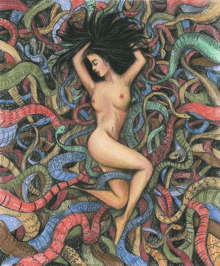 Попыталась сесть. В ответ на попытку незримое ложе еще сильнее заволновалось холодными волнами. Руки и живот опоясали плотные петли. Точно такие же петли шершавыми бугристыми веревками затянули щиколотки и с силой раздвинули ноги. Возле уха раздался мерзкий стрекочущий звук, похожий на звук трещотки. И тут до неё дошел весь ужас того положения, в котором она оказалась. Она лежала в яме, полной змей. Изо рта вырвался слабый крик, но одна из рептилий шлепнулась ей на лицо и скользнула к раскрытым губам. Она не успела вдохнуть, как острый комок оказался в горле. Другая, толстая и скользкая змея, приподняв скуластую морду, взвилась возле раздвинутых ног. Секунда и она вползла в распахнутое лоно…