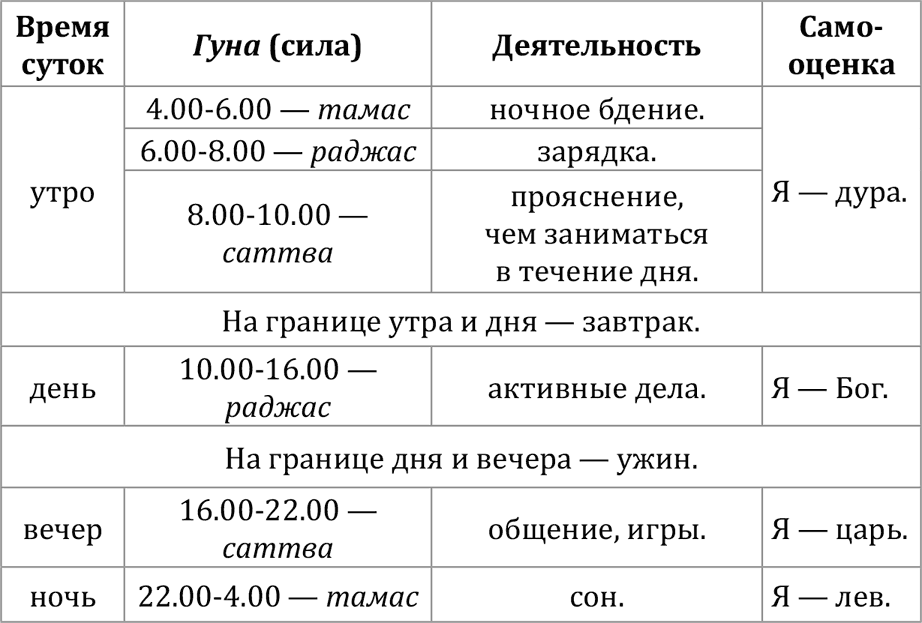 В таблице, приведённой ниже, соотнесено время суток и гуны материального мира, плюс рекомендации, что следует в эти периоды делать и какую задавать себе самооценку: