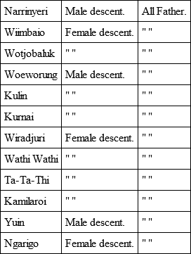Euahlayi – Female descent – All FatherHere, then, we have eight tribes with female descent and the All Father, against five tribes with male descent and the All Father, in the area to which Mr. Howitt assigns "the advance from descent in the female line to that in the male line." The tribes with female descent occupy much the greater part of the southern interior, not of the coastal line, of South-East Australia.