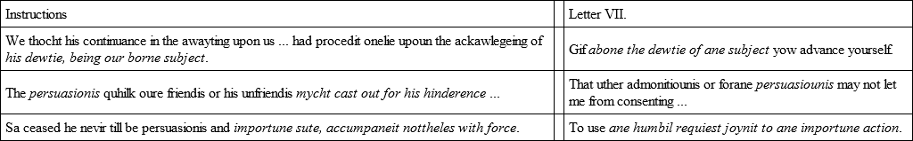 The whole scheme of excuse given in Letter VII. is merely expanded into the later Instructions, a piece of eleven pages in length. ‘The Instructions are understood to have been drawn by Lethington,’ says Sir John Skelton; certainly Mary did not write them, as they stand, for they are in Scots. ‘Many things we resolved with ourselves, but never could find ane outgait,’ say the Instructions. ‘How to be free of him she has no outgait,’ writes Maitland to Beaton. If Lethington, as Secretary, penned the Instructions, who penned Letter VII.?