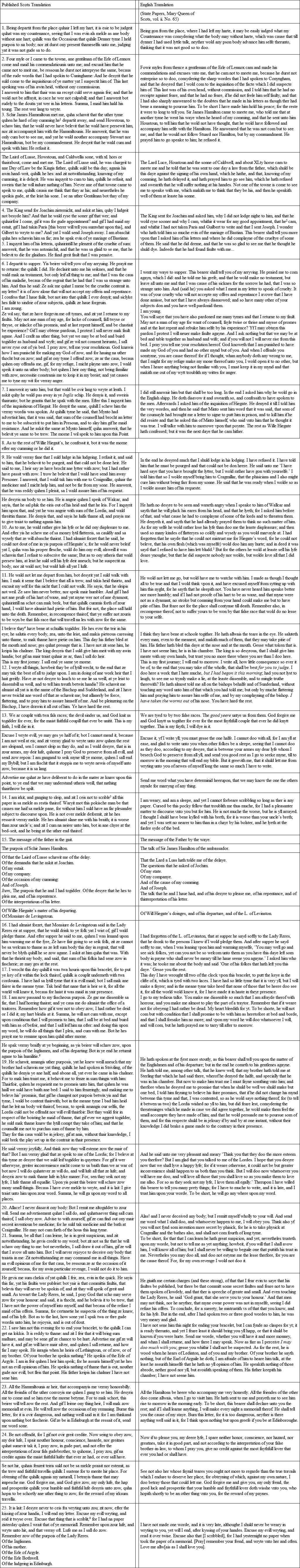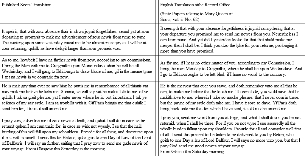 The English text is sometimes right where the Scots is wrong. Thus, Sir James Hamilton told Mary, as she entered Glasgow, that Lennox sent the Laird of Houstoun to tell him that he (Lennox) ‘wald never have belevit that he (Sir James) wald have persewit him, nor zit accompanyit him with the Hamiltounis.’ The English has what seems better, ‘he,’ Lennox, ‘wold not have thought that he would have followed and accompany himself with the Hamiltons.’ In the end of a paragraph (3), the Scots is gibberish: Scots, ‘nevertheless he speikis gude, at the leist his son’: English (Henderson), ‘and they so speakith well of them, at least his sonne,’ ‘and then he speaketh well of them’ (Bain). The English then omits (Scots) ‘I se na uthir Gentilman bot thay of my company.’
