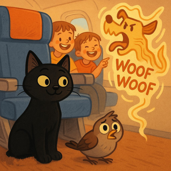 – Мяу! Это что, собака в самолёте?! – изумился Фьюмик, а у Фантика аж перья встали дыбом – он метнулся под сиденье.