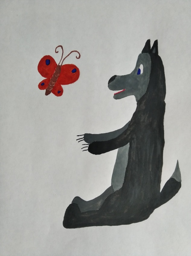 И действительно, на полянку выскочил, играя с порхающей над цветами бабочкой, Волчонок. Зайчонок позвал его, и Волчонок подбежал к друзьям.