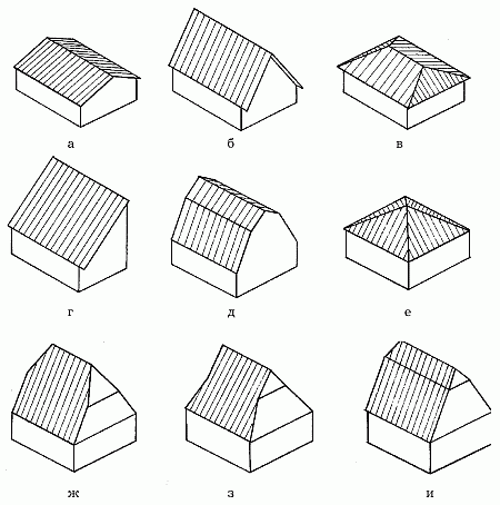 Рис. 16. Виды скатных крыш: а – пологая двухскатная; б – крутая двухскатная; в – вальмовая четырехскатная; г – односкатная (в форме парты); д – ломаная (мансардная) двухскатная; е – шатровая четырехскатная; ж, з, и – полувальмовые (мансардные) четырехскатные