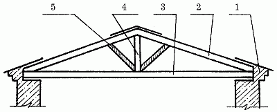 Рис. 18. Висячие стропила: 1 – мауэрлат; 2 – стропильная нога; 3 – затяжка; 4 – бабка; 5 – подкос