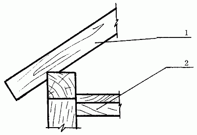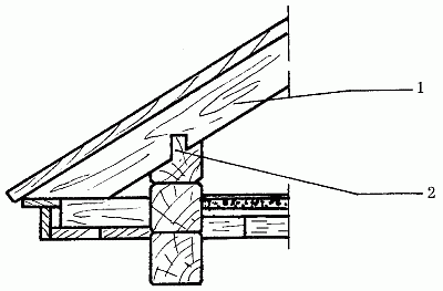 Рис. 19. Наслонные стропила в деревянных брусчатых или рубленых зданиях: 1 – шип; 2 – стропильная нога