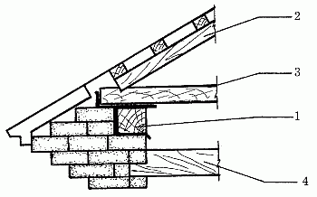 Рис. 21. Наслонные стропила в каменных зданиях: 1 – мауэрлат; 2 – стропильная нога; 3 – затяжка; 4 – чердачное перекрытие